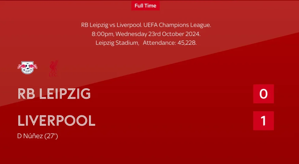 แม้ RB ไลป์ซิกจะมีจังหวะในการกดดันในช่วงท้ายเกม แต่ทีมของอาร์เน่ สลอตกลับไม่สามารถหาทางฝ่าด่านลิเวอร์พูลที่มั่นคงได้ ชัดเจนว่าลิเวอร์พูลเป็นทีมที่มีความมุ่งมั่นและความสามารถในการควบคุมเกม ส่งผลให้พวกเขาเก็บชัยชนะในแชมเปี้ยนส์ลีกได้อย่างต่อเนื่องและรักษาสถิติ 100% ในการแข่งฤดูกาลนี้