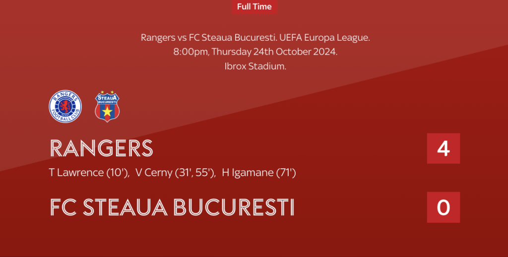 นักเตะที่ลงมาเป็นตัวสำรองในครึ่งหลังอย่าง Hamza Igamane ทำประตูแรกให้กับ Rangers นับตั้งแต่ย้ายมาจาก AS FAR ในช่วงซัมเมอร์ เพิ่มความสวยงามให้กับสกอร์ที่ขาดไม่ได้ในเกมนี้ ซึ่งทีมเยือนที่ดูจะไม่ค่อยมีฟอร์มที่น่าประทับใจนัก แม้จะเคยชนะในสองนัดแรกของยุโรปก็ตาม